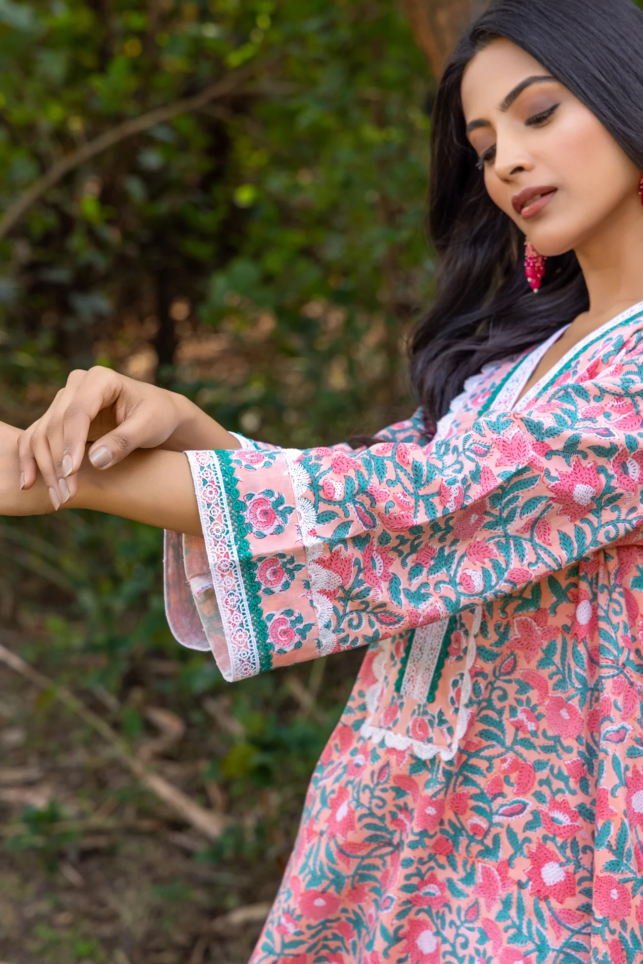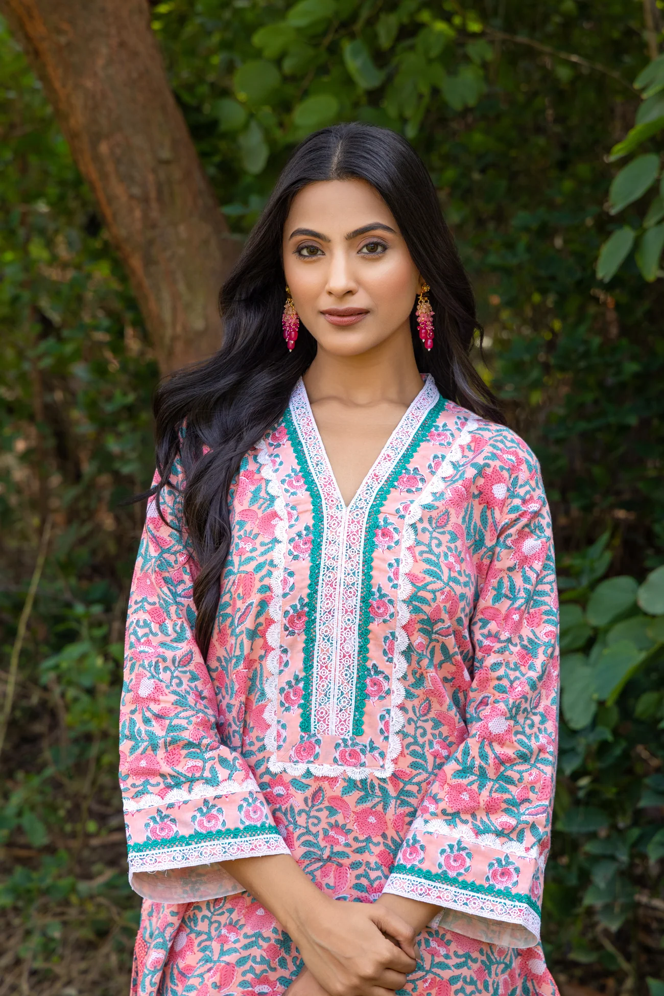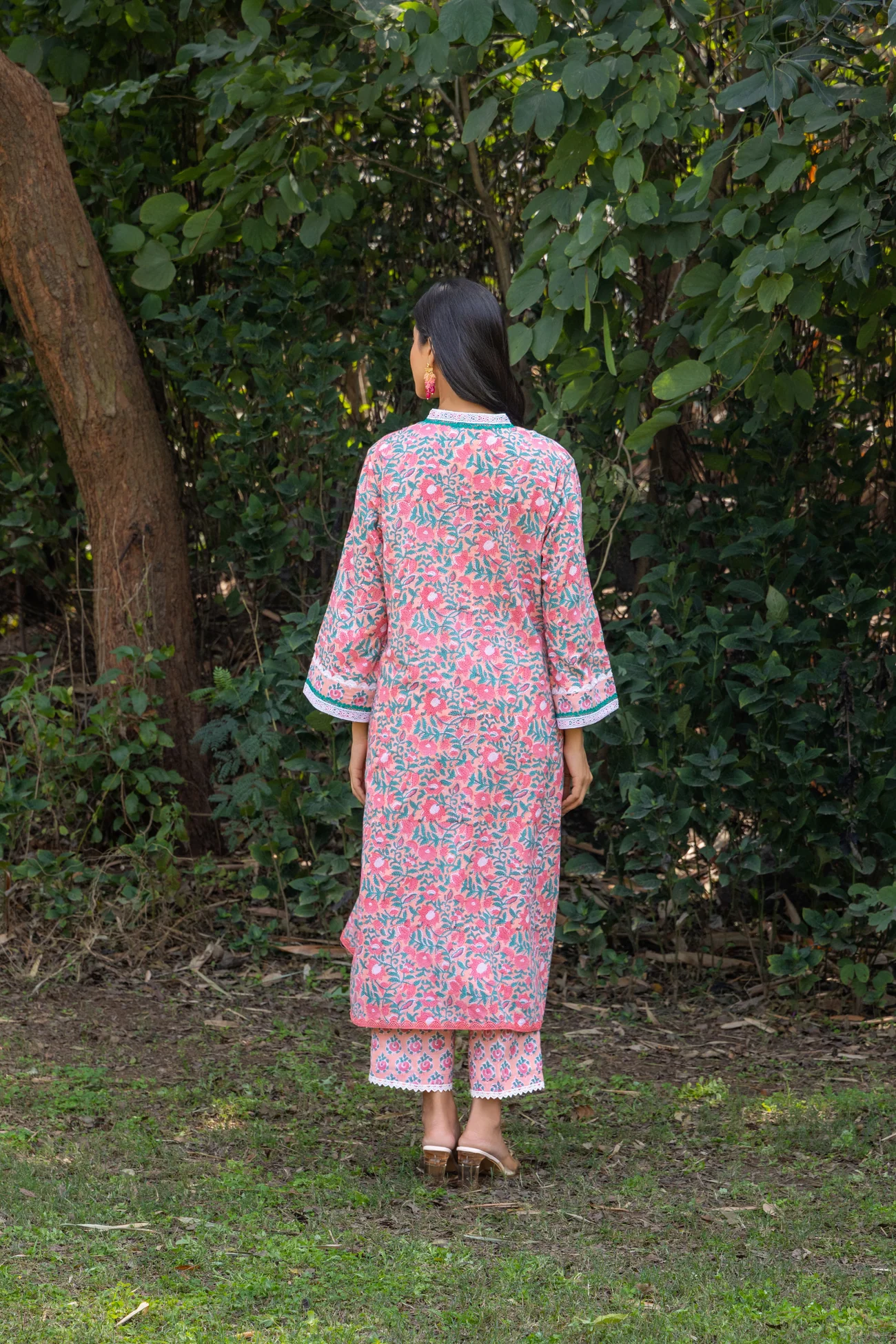 .The set features a block printed A-line kurta paired with semi-elasticated pants made from 100% cotton. Designed with vibrant floral block prints in shades of pink, green, and white, the kurta set exudes freshness and charm. The V-neckline is accentuated with contrast piping, creating a refined and flattering silhouette. The three-quarter sleeves, adorned with delicate borders, add a touch of elegance while ensuring comfort.