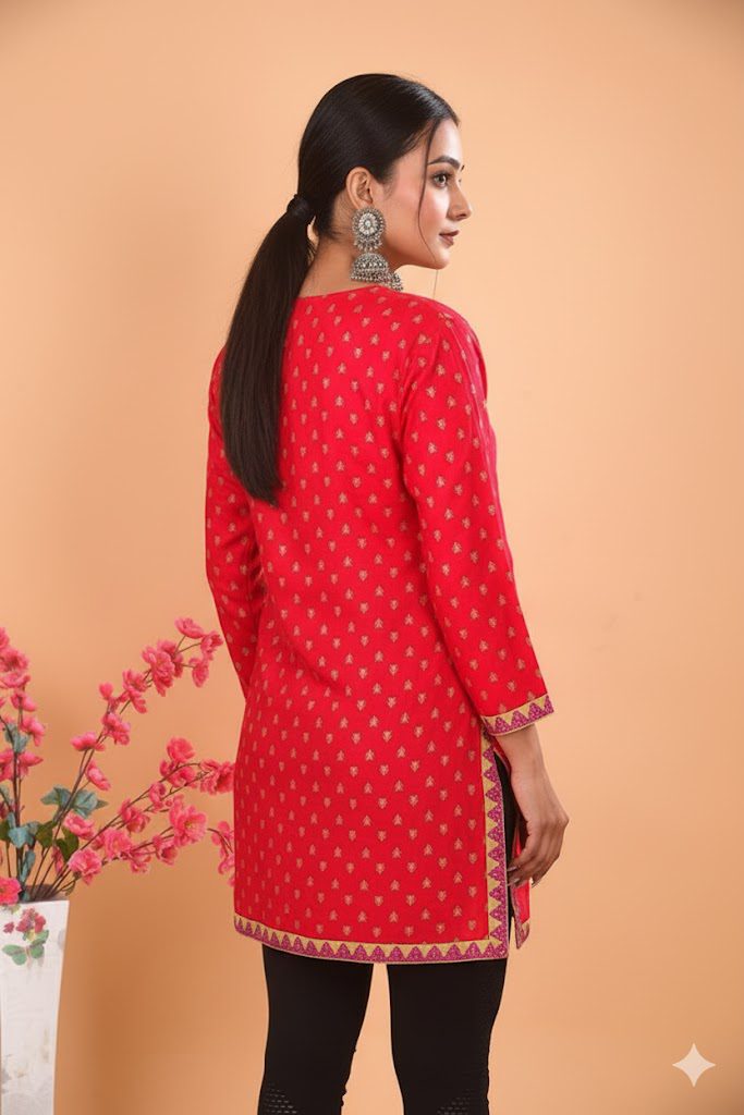This beautiful short Kurti comes in a vibrant red with a subtle all-over gold foil print.