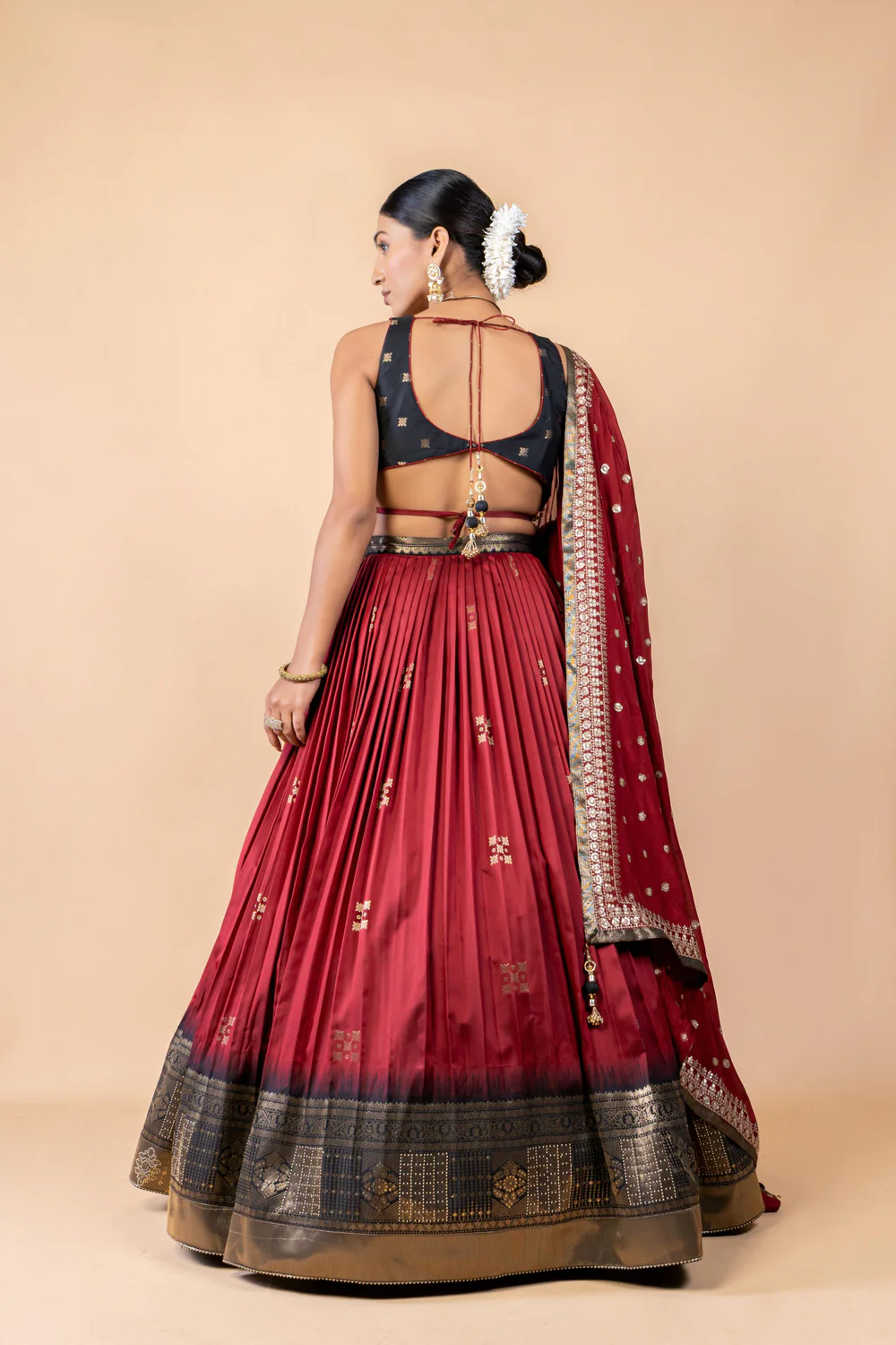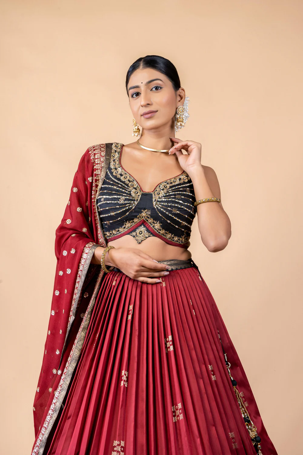 Elevate your festive wardrobe with this luxurious wine-red pleated lehenga, adorned with intricate golden zari motifs and a rich black woven border. The black and gold embellished blouse features exquisite embroidery with shimmering sequin detailing. Complemented by a matching dupatta with delicate buttis and a finely woven border, it completes the regal ensemble. Perfect for weddings, receptions, and grand celebrations.